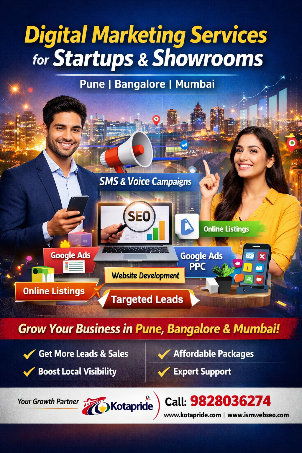 Digital Marketing Services for Startups & New Business Showrooms in Pune, Bangalore & Mumbai – Grow Faster with Kotapride Starting a new business or launching a showroom is exciting—but in today’s competitive market, success depends on how strong your digital presence is from day one. Whether you’re opening a retail showroom, launching a startup, or […]